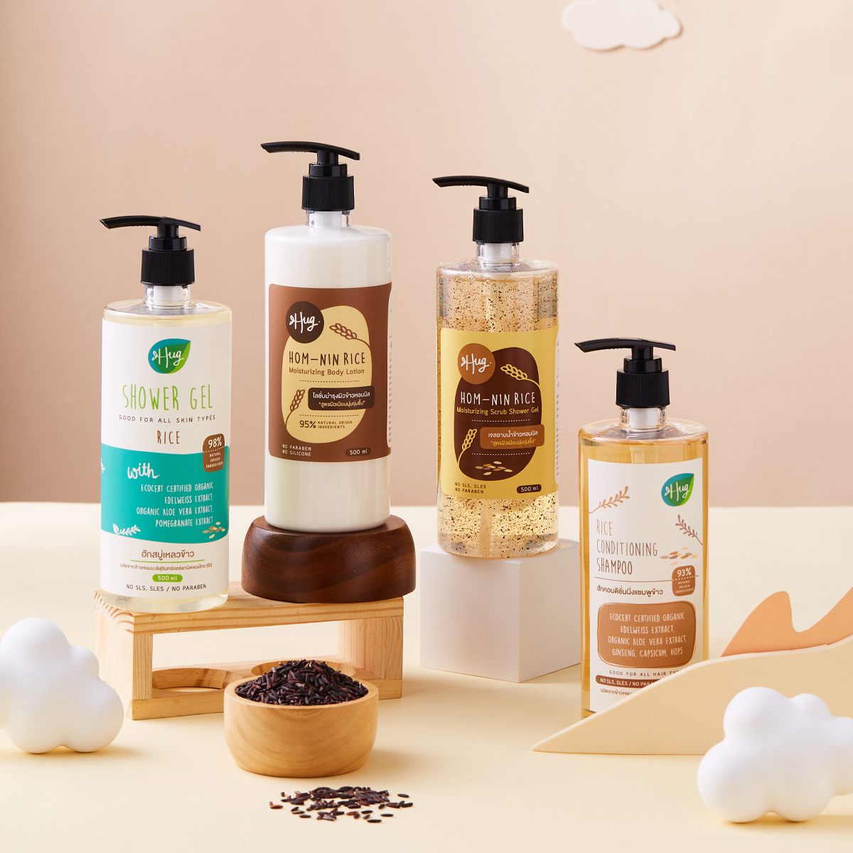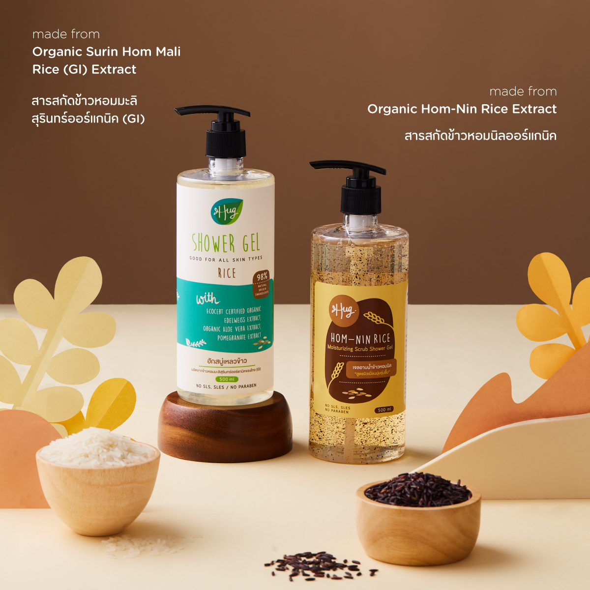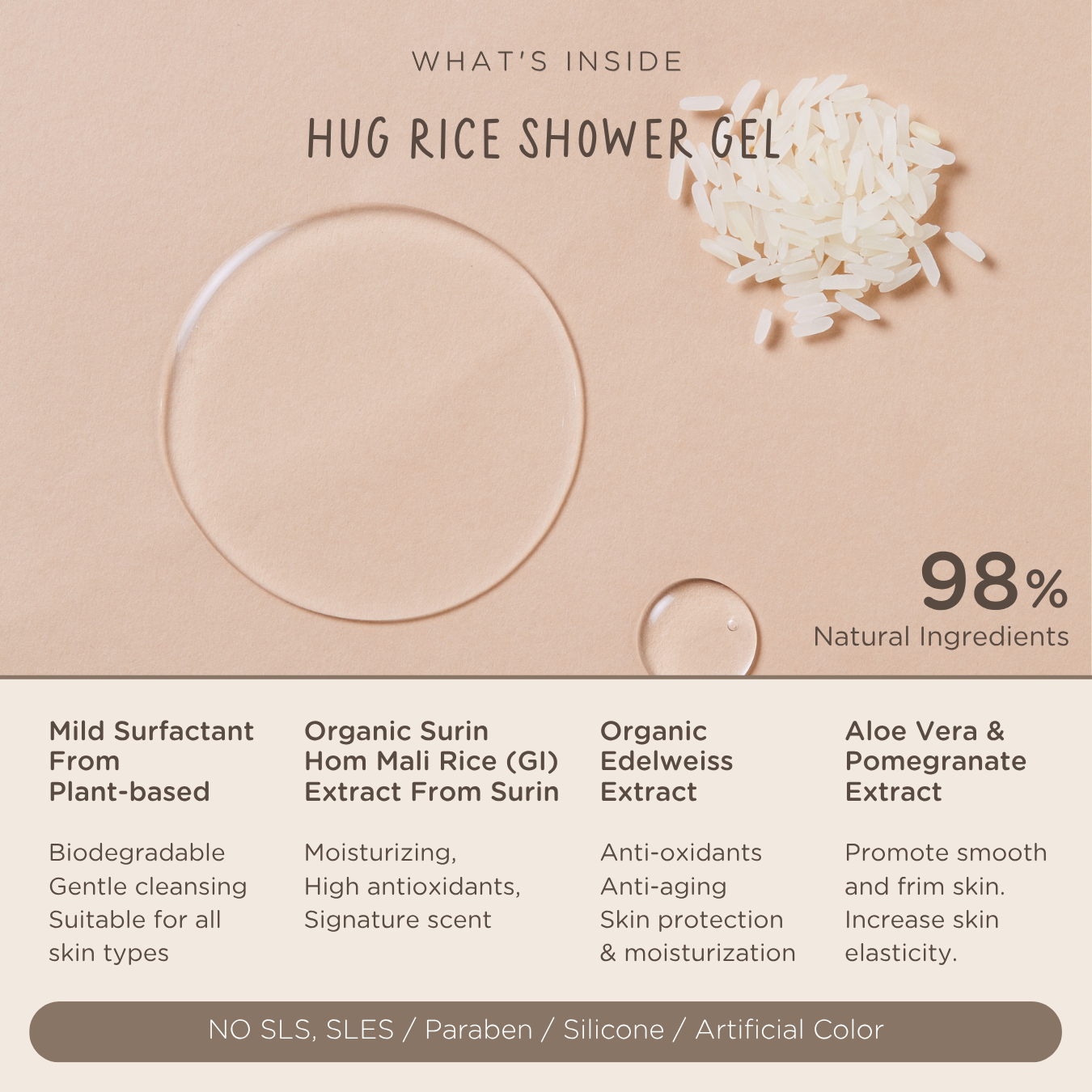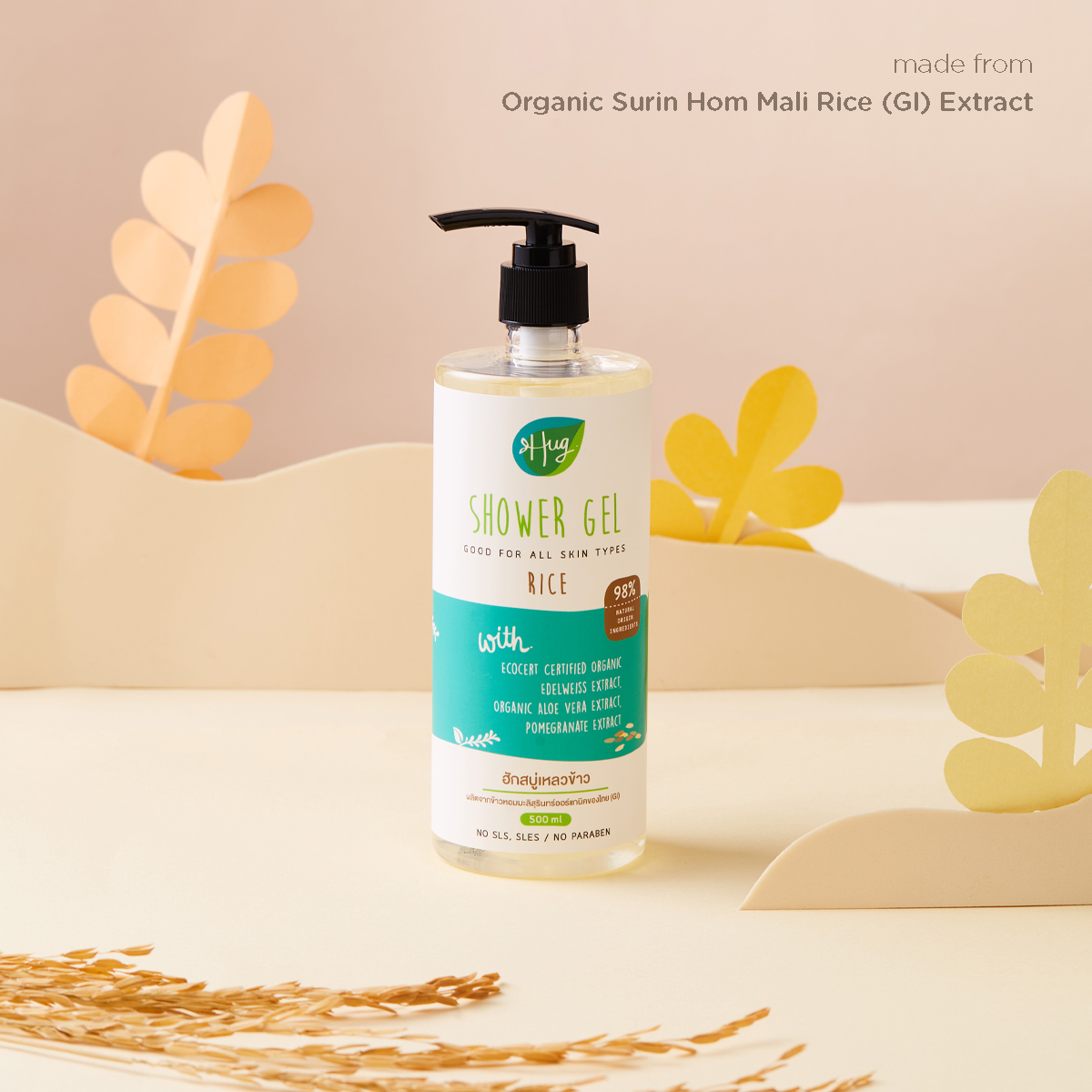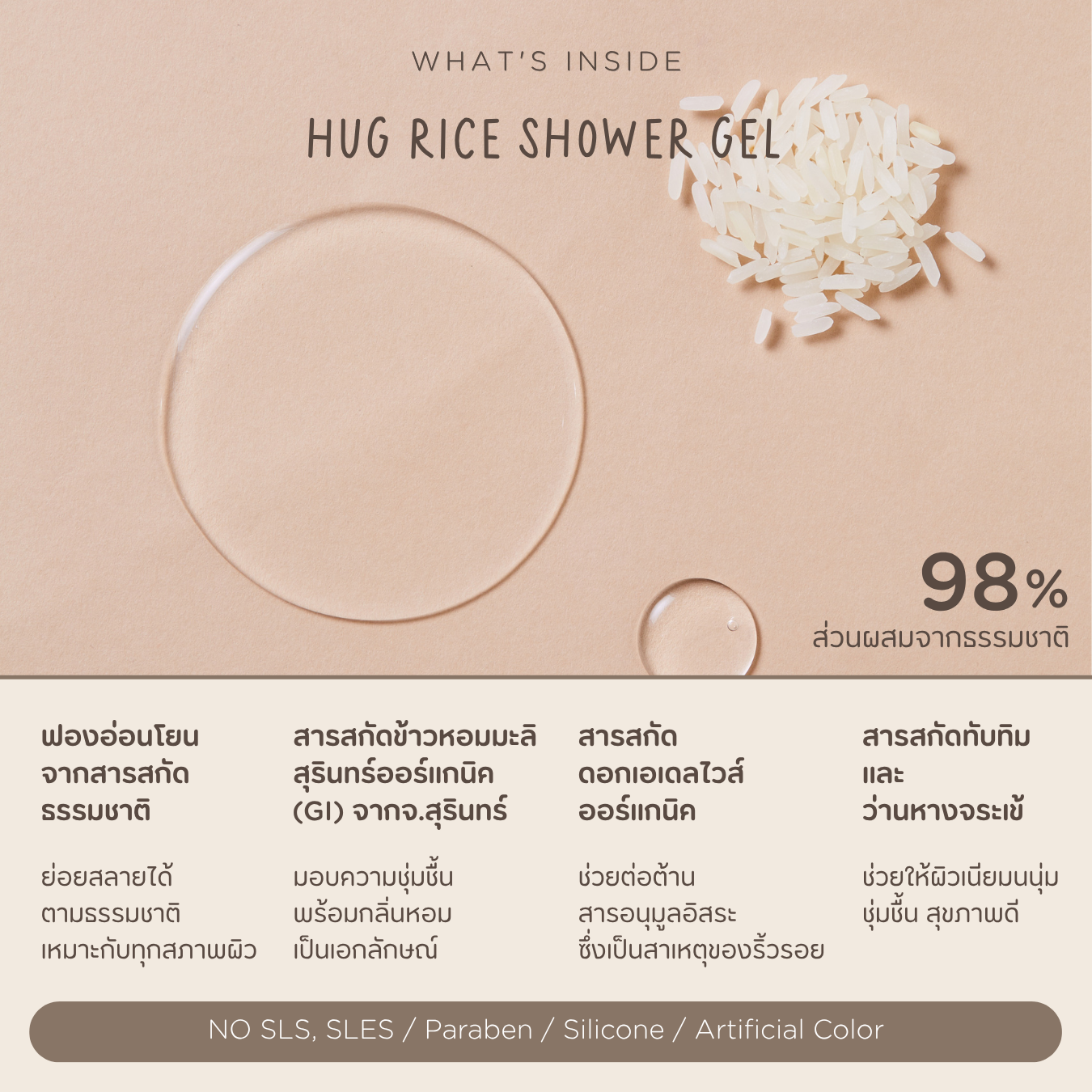 ◆ สารสกัดข้าวหอมมะลิสุรินทร์ออร์แกนิค (GI) จากจ.สุรินทร์ — ช่วยเติมความชุ่มชื้นให้ผิว กลิ่นหอมละมุนเป็นเอกลักษณ์
